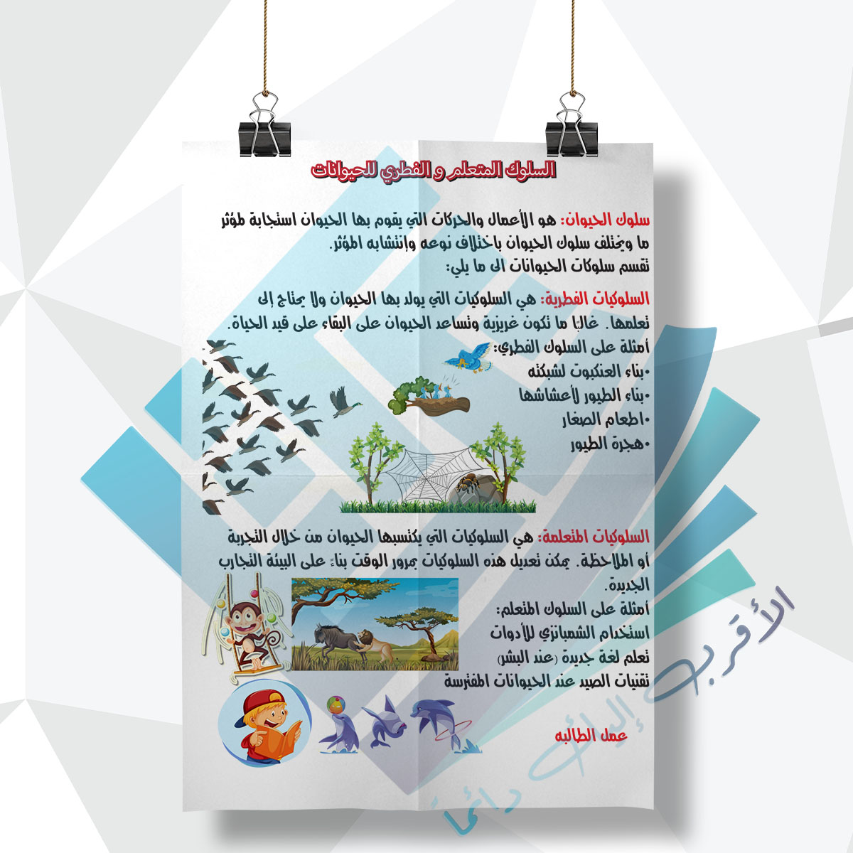 لوحة مدرسية عن السلوك المتعلم والفطري للحيوانات